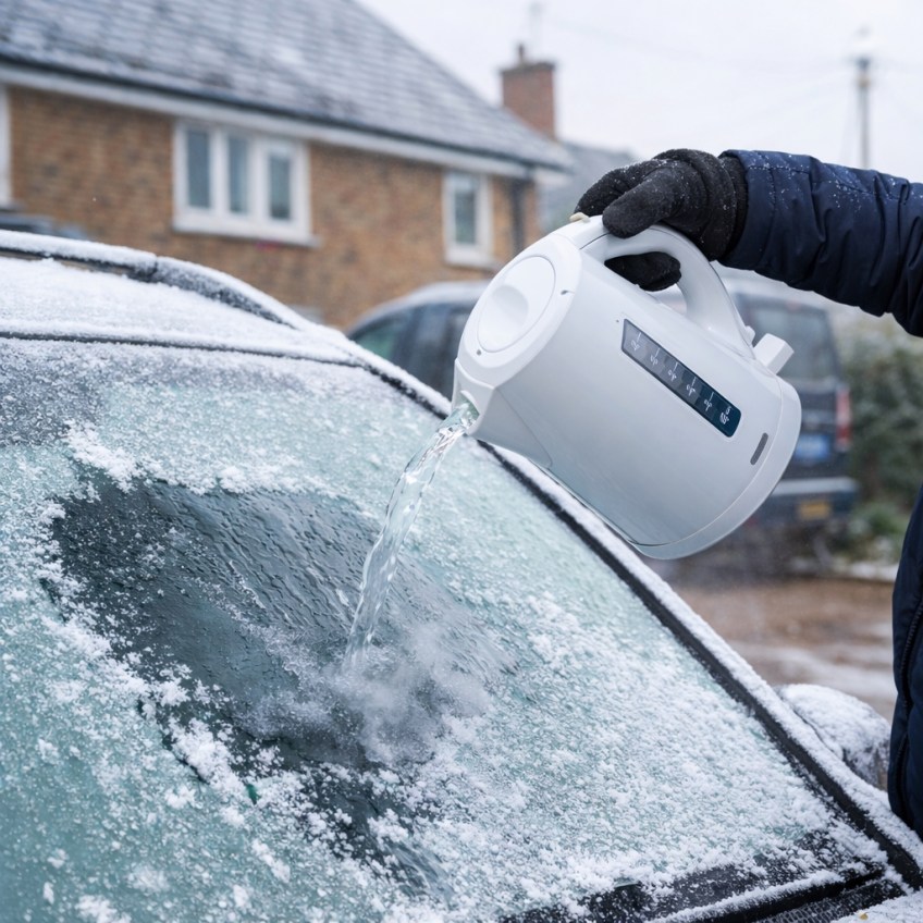 Pouring water on frosted windscreen Published January 5, 2026 at 1024 × 1024 in The Do’s and Don’ts of Clearing Frosted Windscreens & Winter Driving